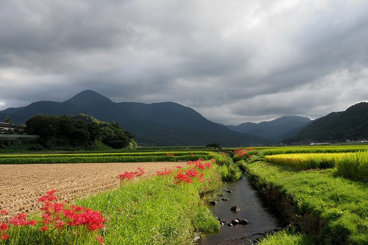 青い空に白い雲、柿栗の鈴生り風景、黄金色田んぼに赤い彼岸花景色、つい