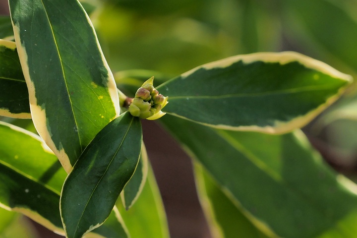 来年の開花を待つ庭のジンチョウゲ(沈丁花、Daphne odora)です。