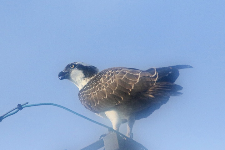 すぐ近くの電柱にとまりましたので、窓を閉めたままでガラス越しに撮った写真