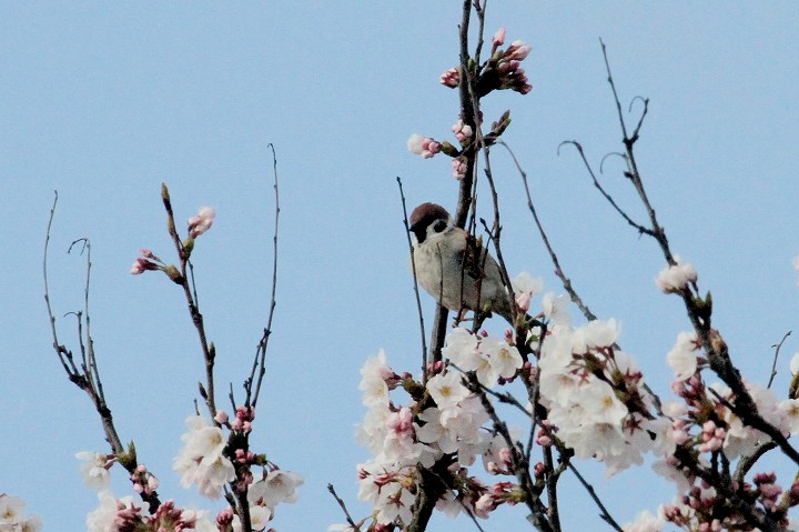 2022年 スズメ 004 戻る 撮影(04/04) 掲載(04/05) 桜が満開になると小鳥が来ますが、主にヒヨドリとスズメです。 静かに蜜を吸っているのはスズメで、時に大声を発しながら蜜を吸っているの はヒヨドリです。 (Canon) EOS 7D Mark II EF400mm F5.6L USM