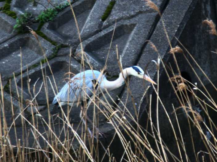 (4)実はこちらの岸におなじみのアオサギが立っていた。