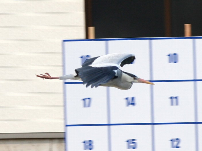 選挙です。投票所に行きましょうと大声で叫びながら飛翔しています。アオサギ