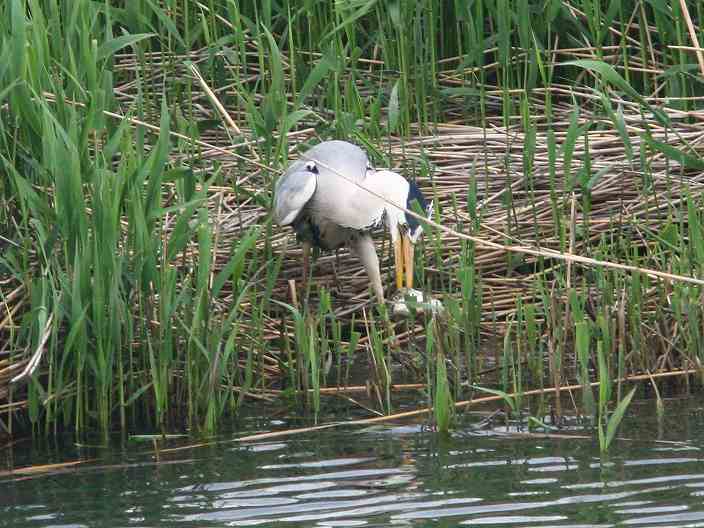 す。魚をくわえて持ち上げている段階のものです。アオサギ045は魚を下ろしてい