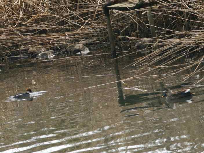 ているのです。そんなハジロカイツブリをカルガモも身動ぎせずにじっと見ています。