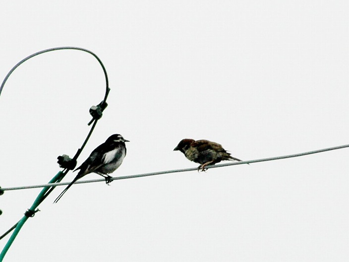 写真左のハクセキレイは高い所が大好きで、異種の鳥と顔見知り関係になって