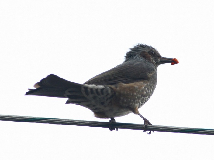 電線に止まり、嘴で銜えている物を周囲に見せびらしています。