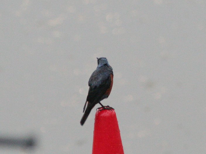 背中の白い羽はすっかり消えて青色になり始めています。雨中でしかも早朝