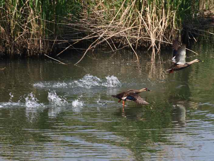 手前の♀?は、後ろの水しぶきから見ますと助走飛び立ちに見えるのですが、