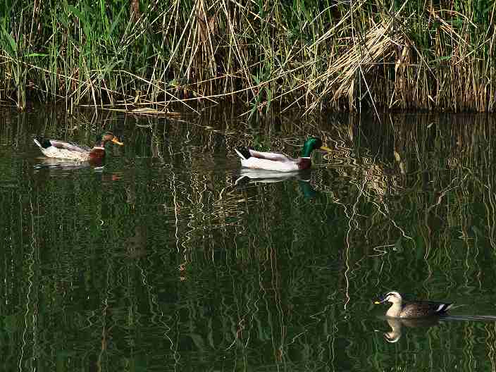 左側の水鳥を見てください。後頭部が前を行く鳥と同じ色で反射しています。♀