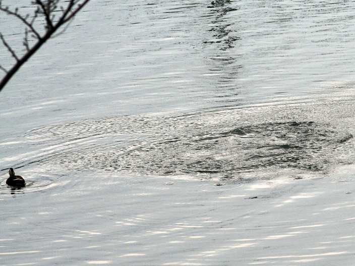 左のカルガモは潜っていません、ま、目印役です。右側はカルガモが潜った瞬間