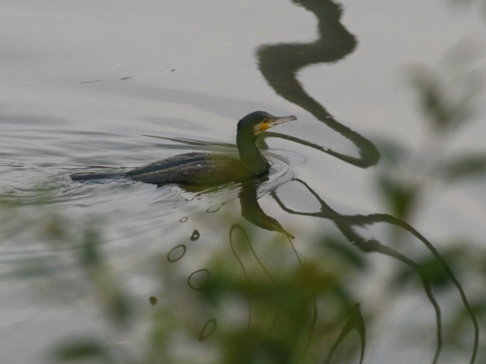 このカワウは1羽だけで来る個体です。アオサギと非常に懇意です。自分の方