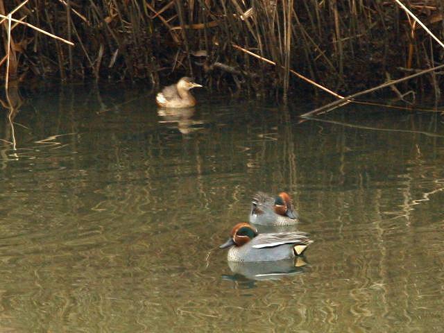 コガモに新年のご挨拶をさせまさす。カイツブリが混じっていますが、元旦にモ