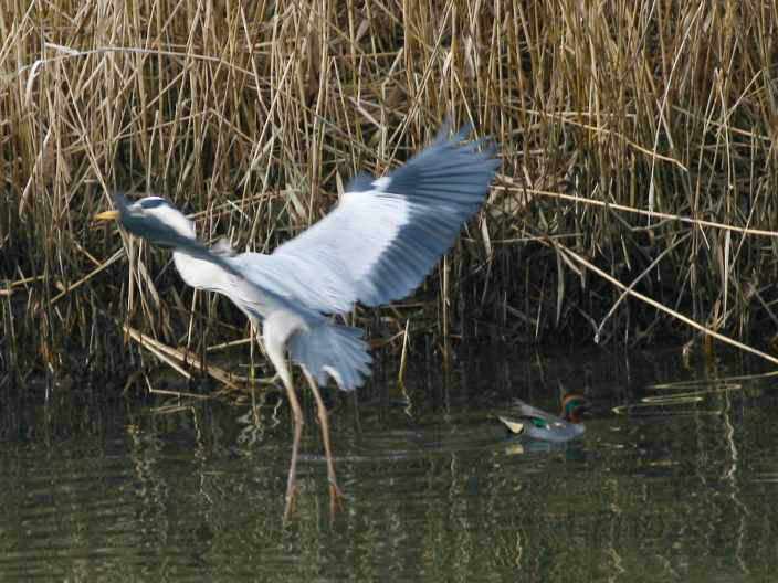 2007年 コガモ 005 戻る 撮影(01/21) 掲載(01/24) このようにアオサギは平気でコガモの近くに下り立ちますし、コガモもちょっと移 動するだけで実に平静です。 (Canon) EOS Kiss Digital X EF 200mm F2.8L U USM + (KENKO)1.4X DIGITAL TELEPLUS PRO 300