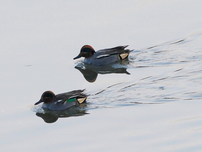 緒に飛来し、同時に着水したコガモ♂2羽だと考えています。