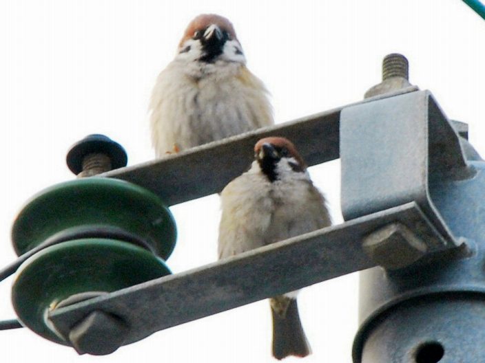 2007年 スズメ 002 戻る 撮影(01/24) 掲載(01/24) 本日スズメが2羽で来ました。 下の方は嘴の基部に黄色いような色が見えますので、昨年生まれの幼鳥では なかろうかと思っています。では上の方は成鳥かと訊かれると、白い頬に見える 黒い部分が小さいようにも感じますので幼鳥だろうと考えます。 (NIKON)D80 Ai AF VR Zoom Nikkor ED 80-400mm F4.5-5.6 D