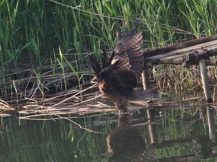 トンビは長い時間の考慮の末、白い腹を見せて浮いているコイの真上に飛び