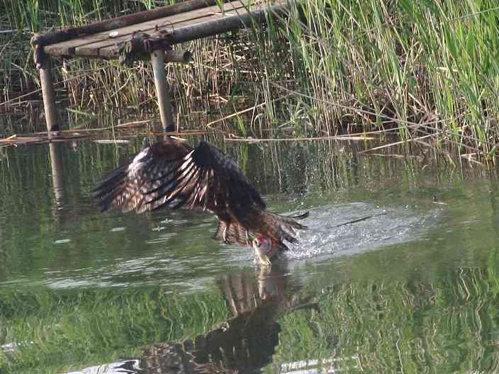 大きな鯉と共にトビの体は多くの部分が水に浸かったように見えました。しかし