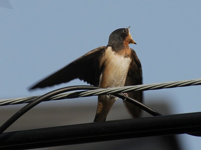 さて此のツバメは少し毛色が違います。いくら待っても親ツバメは此のツバメに