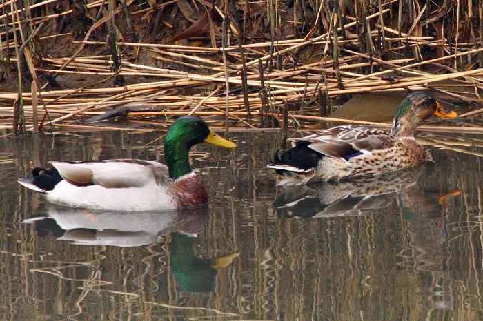 この♂(左)の嘴は黄色ですが、マガモ♂の嘴は黄緑色です。ですからこれも