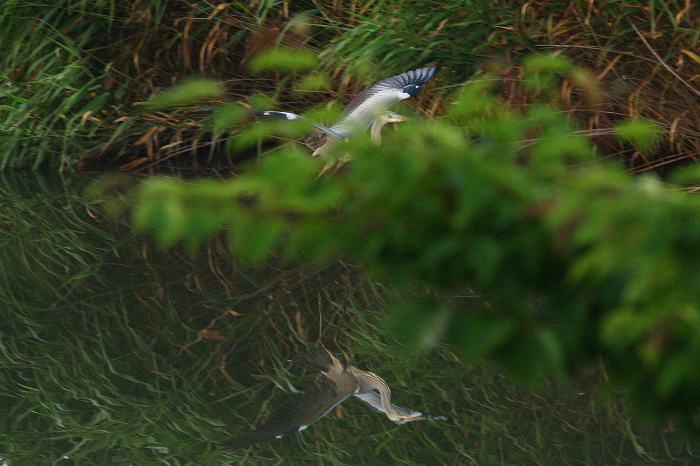 2008年 アオサギ 020 戻る 撮影(07/10) 手前のサクラの葉っぱが障害物ではっきりしない画ですが、アオサギは向こう 岸近くを飛んでいます。下の川面に映った画の方が分かり易いという変な写真で す。 上空を左方向に向けて飛翔していたのですが、川でカルガモのチビ連が泳いで いるのを見て、引き返して来て、右方向に飛んでいきました。 (Canon) EOS 40D EF 300mm F4L IS USM