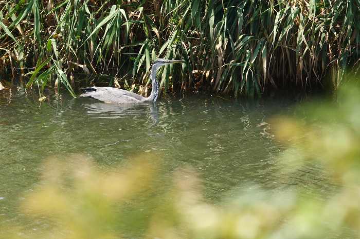 写真のアオサギ、葦が邪魔で飛び立つことが出来ませんので、どうするだろうか