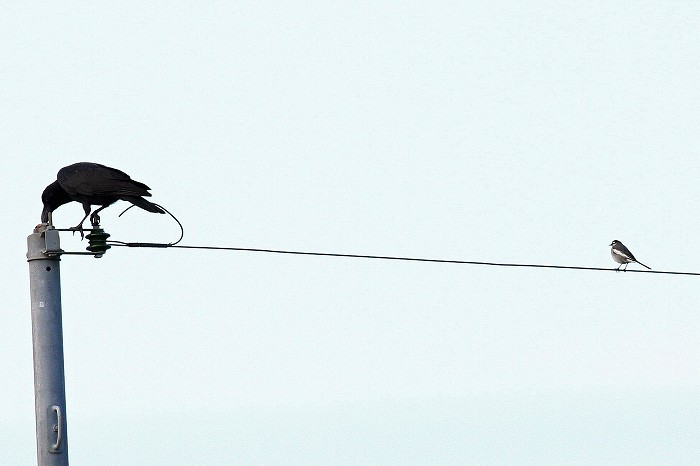 カラスが来た時、対岸から小鳥がカラス目がけてスクランブル発進し、カラスが
