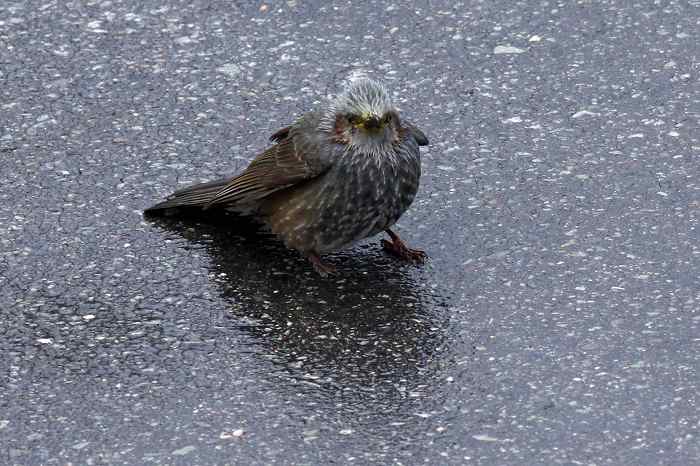 2008年 ヒヨドリ 005 戻る 撮影(02/24) 強烈な冬の季節風が起こす突風に対して、道路にへばりついて頑張っている 姿です。 歩いたり飛んだりして安全な場所に行きたいのでしょうが、そんなことをすれば 吹き飛ばされます。 (Canon) EOS 40D EF 400mm F5.6L USM