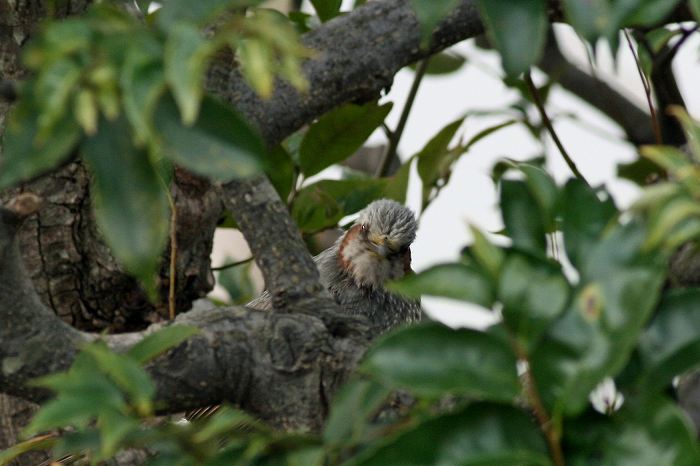 木の葉っぱに隠れて、カメラの方を見て笑っています。何でも食べる鳥、という