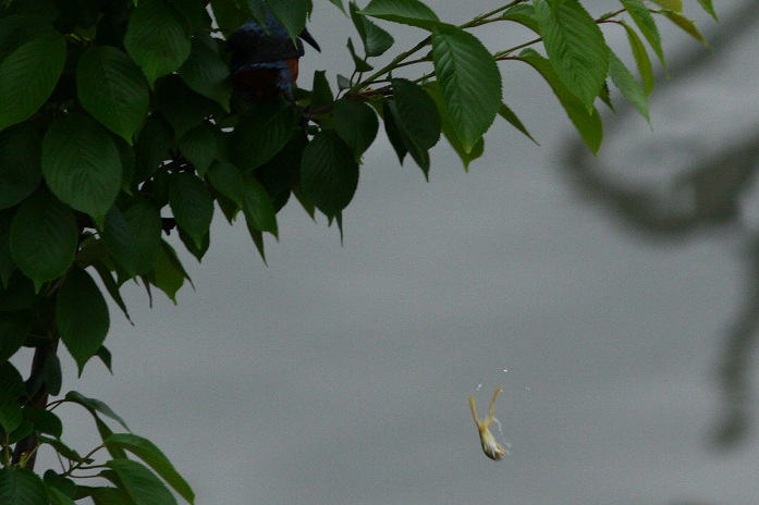 なお、木の葉っぱの間にイソヒヨドリ♂の赤い腹が、ちらりと見えています。