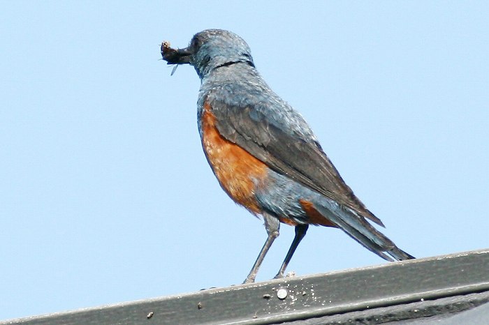 2008年 イソヒヨドリ 073 戻る 撮影(06/13) たまらずイヒ三世はエサをくわえて現れました。 「さあ、こっちに来なさい。エサを持ってきたぞ。ただし今からは大きな声で鳴か ない事を約束しなさい。約束出来なければ、此のエサはあげないぞ。」とかなんと か言うつもりだろうと思います。 そこで幼鳥がやって来ました。次です。 (Canon) EOS 40D EF 300mm F4L IS USM