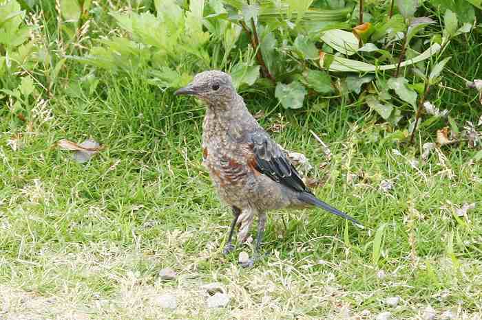 2008年 イソヒヨドリ 085 戻る 撮影(06/15) 写真「084」ど同じイソヒヨドリ♂です。前面はこんな具合です。鱗状模様が消 え始め、鱗のように見えた羽が横向きにお椀状に長くなってから、それも消えて、 その部分に赤褐色の羽が出て来ているように感じます。 この特徴を考えて観ると、もっと早い時期に♂♀が判別出来そうだと感じます。 (Canon) EOS 40D EF 300mm F4L IS USM