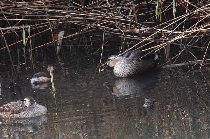 手前のカルガモも、カイツブリが近づいていることは、ちゃんと知っていますが、