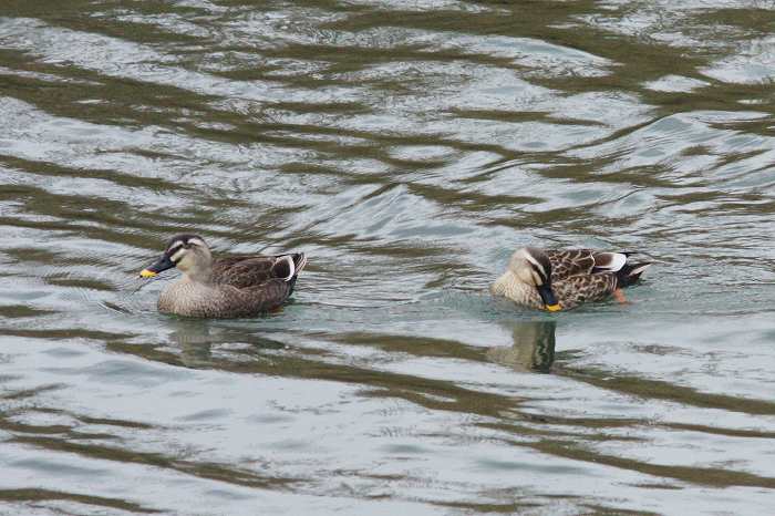 左のカルガモに1羽が近づいて来て、反対方向に顔を向け、盛んに顔を上下し