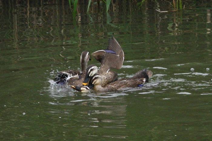 喧嘩していて、逃げる1羽を追っかけて来たために、勢いよく川に落ちたのだろう