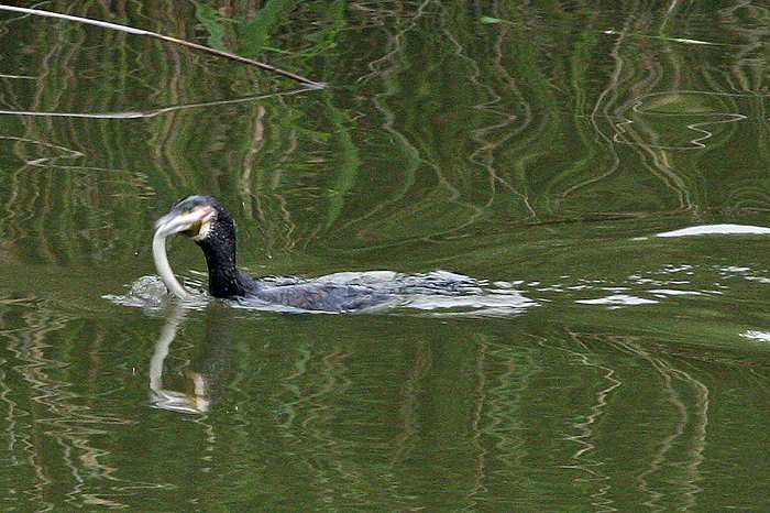 普通のカワウはもたもたして、大騒ぎになり、ついには疲れ切って、食べるの