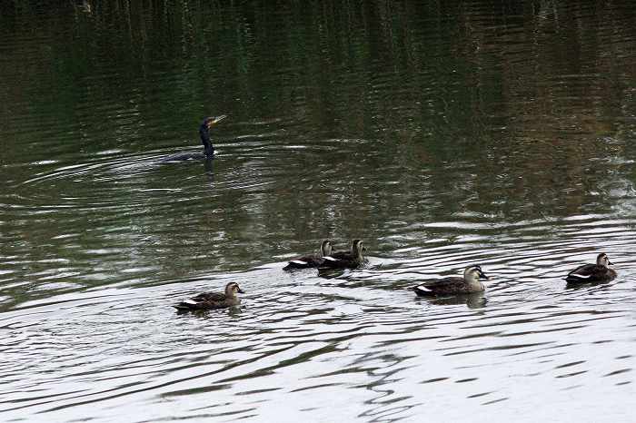 此のカワウはカルガモの配置図をよく頭に入れて潜っているように感じました。