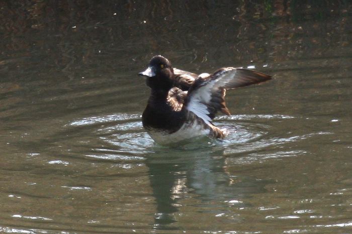 2008年 キンクロハジロ 009 戻る 撮影(04/03) 虹彩は黄色です、しかし冠羽は見えません。じゃぁ、スズガモ♀、ではないのか い? と問われれば、がくんと弱り切ってしまふのですが、同じ個体で他の写真に 冠羽(+)ですので、キンクロハジロです。 (Canon) EOS 40D EF 400mm f/5.6L USM