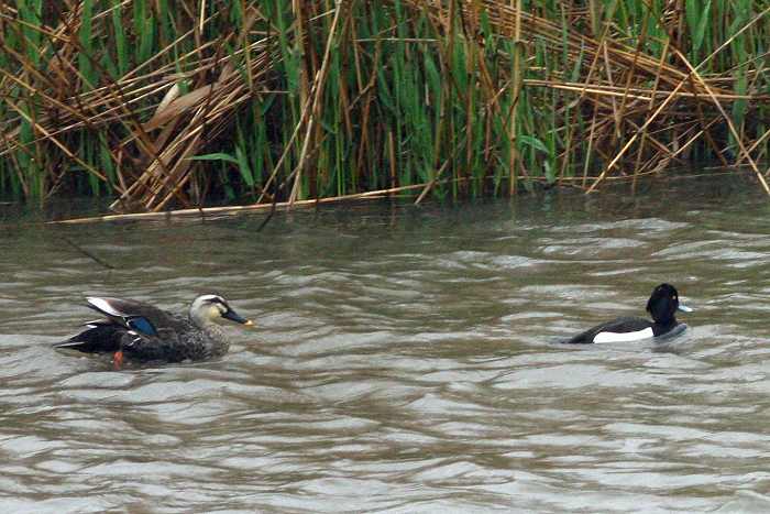 海ガモ類は川に入って来ますし、カルガモは生き生きとして、雨風の中で求愛行