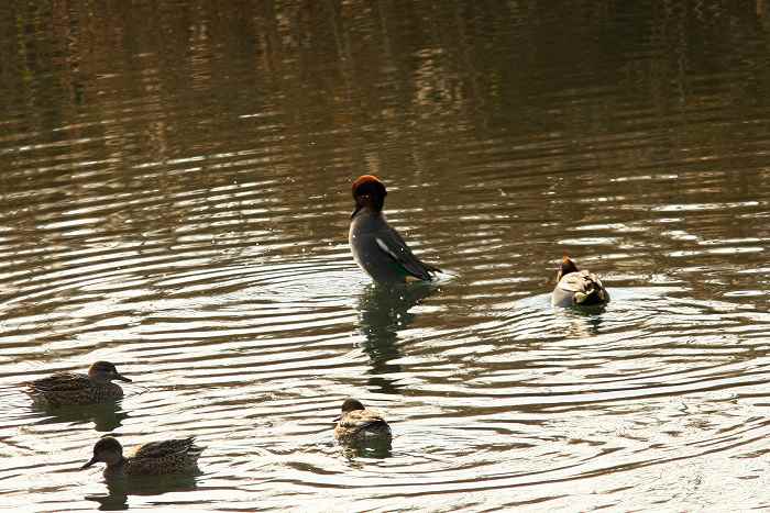 2008年 コガモ 004 戻る 撮影(01/10) ♂の求愛ポーズです。 この姿は多くの鳥に見られるポーズだと思います。標準的なものです。 この時、「ぴぃっ」と鳴きます。カルガモは「ぴー」という声を上げます。鳴き声を 出す時は、上を向いているかもしれませんが、コガモは動きが速くて、うまく撮れ ませんでした。まだまだ修行不足です。 (Canon) EOS 40D EF 300mm F4L IS USM + EXTENDER EF 1.4X U
