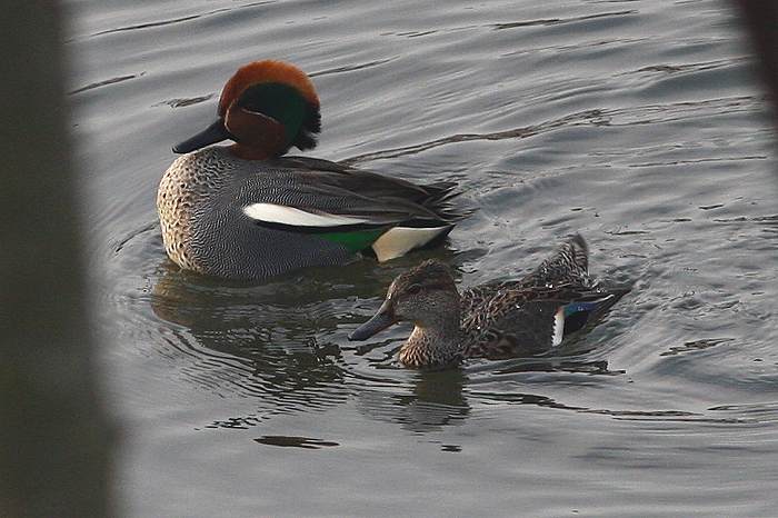 ♀の右側に下りました。カルガモと同じです。♀の頭部の毛具合を見れば、交