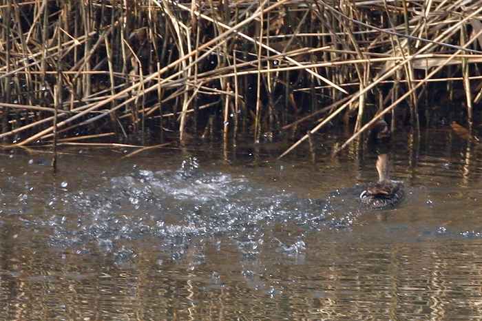2008年 コガモ 015 戻る 撮影(02/22) コガモA「やっぱり羽が汚れてる。えーいっ潜っちゃえー。ぐわーっ。もぐもぐー。」 コガモB「潜ったわー! びしょ濡れになるから、逃げろー。くぁぐわーっ。」 (Canon) EOS 40D EF 300mm F4L IS USM