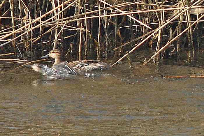 2008年 コガモ 017 戻る 撮影(02/22) コガモB「びっくりするじゃないの。私の側で浮かないでよ。グワ、ぎょぎょ。」 コガモA「分かっているでしょう。コガモは、潜ったら最後、何処に浮くのか分か らないわよ。あれ、こんな所に浮いちゃった。あれあれ? ぐわっ、ぐえ〜。」 (Canon) EOS 40D EF 300mm F4L IS USM