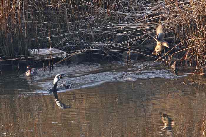 前にカワウがぶかっと浮いて来たのです。びっくり仰天したコガモ♀が飛び上がっ