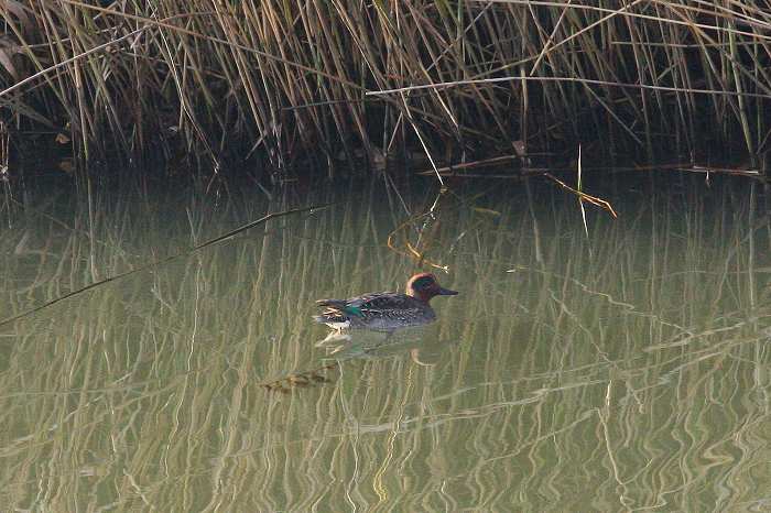 2008年 コガモ 038 目次へ 撮影(11/05) 予想通りコガモが現れました。これは♂ですが、未だ成鳥♂にしては未完成の 姿のように感じます。エクリプスと表現しても良さそうです。 しかし、ここまで変身したのは日本国内に来てからでしょうから、何処か近くの池 や湖などに居て、先遣隊員(♀)の情報を得てから窓外水域に移動して来たのだ ろうと推測しています。 (Canon) EOS 40D EF 400mm F5.6L USM
