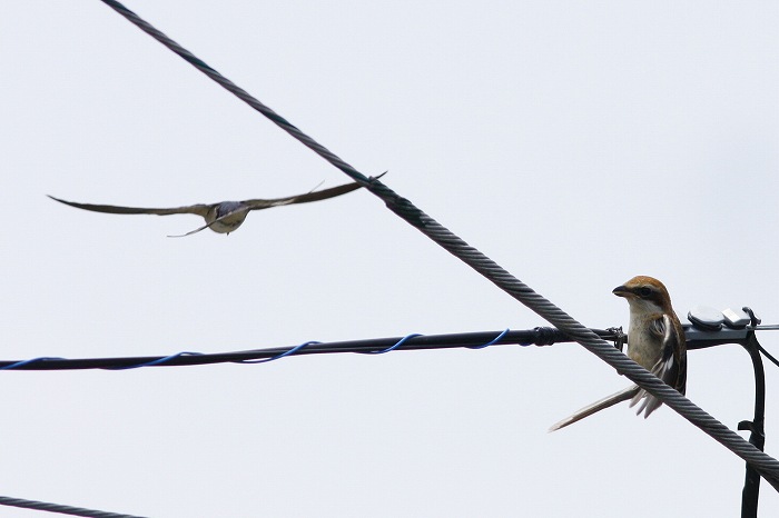 ツバメの攻撃にびっくりして、腰を抜かして電線から落ちそうになっているモズ