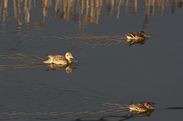 右2羽はコガモ♀です。問題は左1羽です。顔から判断してオナガガモ♀、とい