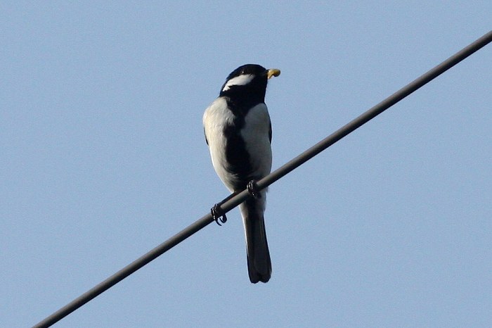 2008年 シジュウカラ 007 戻る 撮影(05/03) エサをくわえたまま電線にとまり、そのエサを周囲にみせびらかしています。い よいよ子育てを始めたか、と予想します。 周囲に嘴のエサを見せて、そのエサを狙って危険な鳥が来ないかを見て、安 全を確かめてから自分の巣へ帰るように思います。 ヒナが待っているのかもしれません。 (Canon) EOS 40D EF 300mm F4L IS USM