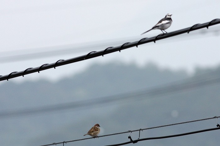 下に居るのが変なスズメです。異種の鳥がイヒ四世候補のソングポストや近く