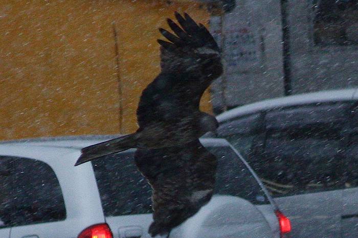 これは突風と降雪を予測出来ず、飛べなくなって、あわや車の上に落ちそうになっ