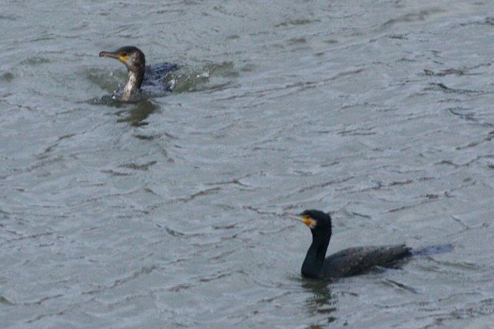 写真上がウミウ幼鳥で、下がカワウ若鳥です。